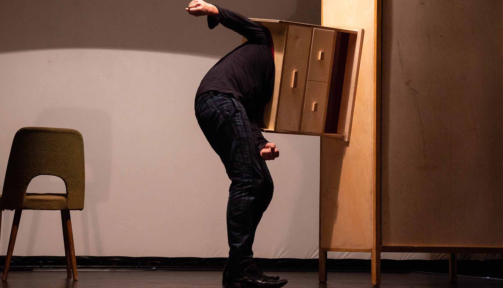 Obývacia izba je expedíciou ľudskej fantázie do neprebádaného teritória nábytku. Odohráva sa medzi fiktívnymi stenami jednej izby – vo svete nábytku, ktorý existuje paralelne s naším vlastným. Každý predmet tu má svoj vlastný charakter a pôsobí svojím jedinečným spôsobom. Inscenácia Lukáša Karáska balansuje na hranici divadla masiek, tanca a cirkusu a rozohráva vzrušujúcu hru plnú fantázie a humoru. V spolupráci s Jazmínou Piktorovou divadlo uvádza špeciálnu exteriérovú verziu prispôsobenú mladým divákom a diváčkam. V nej sa nábytok vydáva na prechádzku. Chceli by ste si s ním zahrať partiu guličiek? Otvorte zásuvky svojej fantázie a vysypte zo svojich spální tie najbláznivejšie fantazijné postavičky.